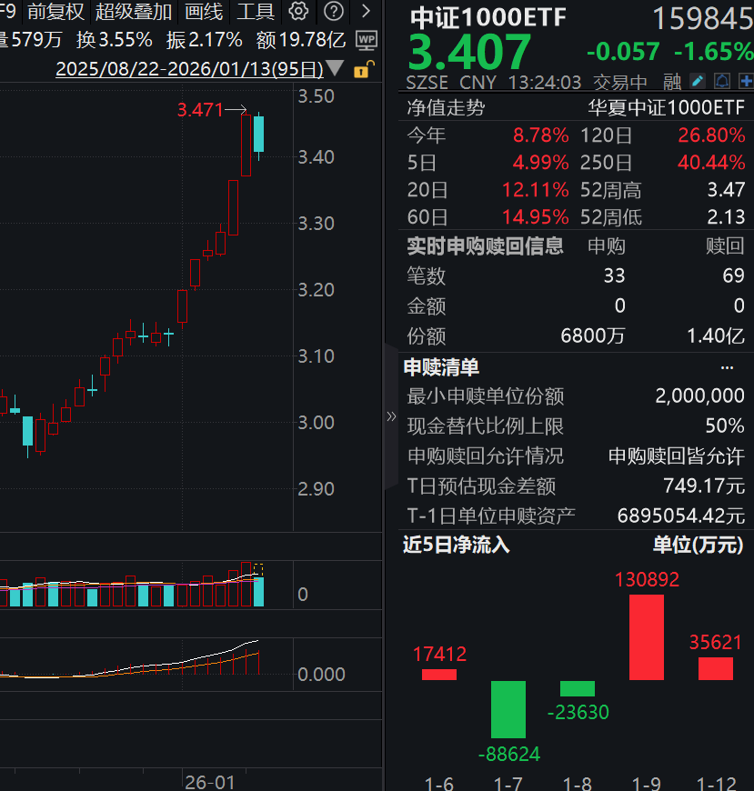 1月13日午后,A股三大指数集体下跌,其中沪指下跌0.37%。截止13点23分,中证1000ETF(159845)下跌1.65%。其他宽基指数中,上证50跌0.10%,沪深300跌0.36%,中证500跌0.90%。